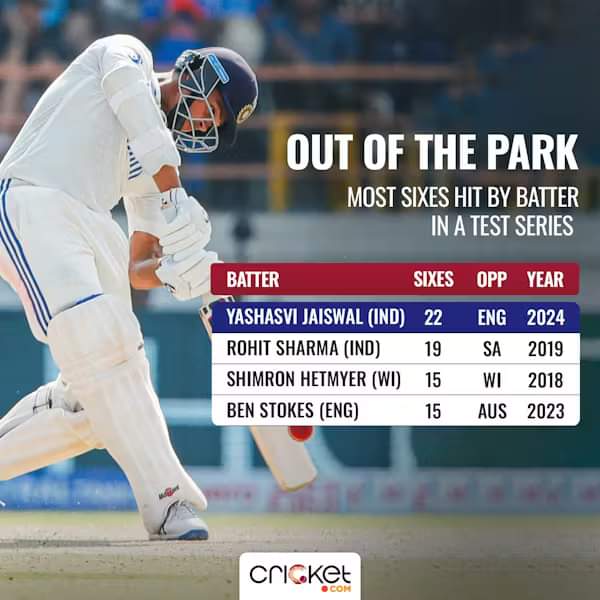 Overall, Jaiswal has hit 22 sixes in this series, which is the most by any batter in a bilateral Test series. And we still have two more Tests to go. In fact, he already has 25 sixes in seven Tests, the most for any batter since his debut in July 2023.
