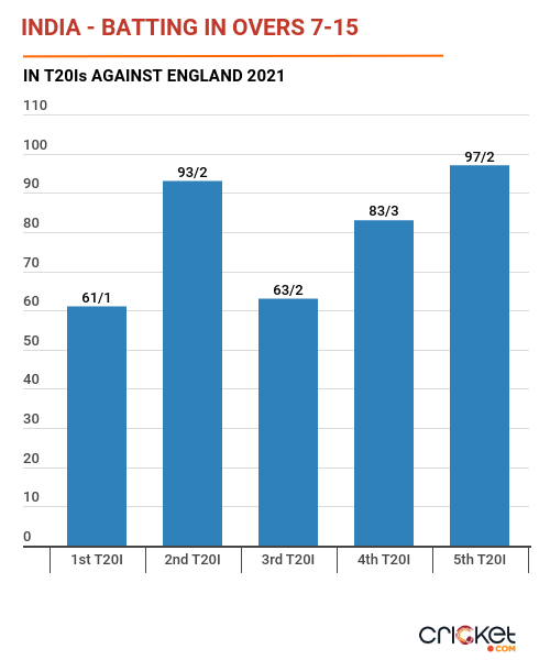 India swapped Shikhar Dhawan with the more aggressive Ishan Kishan as an opener in the second T20I. The effect was immediate. A natural boundary hitter, Kishan carried on even after the Powerplay to score a fifty on debut. Statistically, the seventh over of a T20 innings is the one with the lowest run-rate: 6.7 in T20Is featuring full member nations of the ICC. Kishan and Kohli smashed Ben Stokes for 17 runs in that over, the most in the innings. India went on to add 93 runs in the nine overs in an easy run-chase.