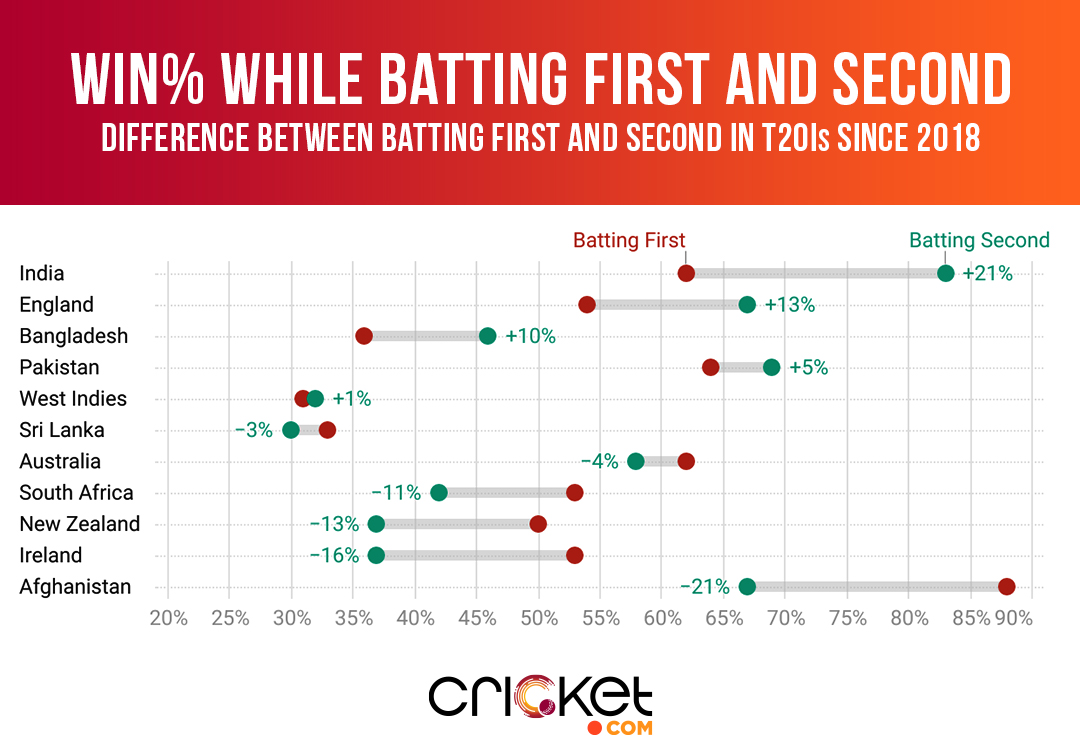 In T20Is since 2018, the difference in win percentage while batting second versus first for India is 21% - the highest among all sides. Learning to set-up challenging totals with the help of aggressive batters, India managed to win the last two games after England asked them to bat. Looking ahead, this was a bigger plus for India than the outcome of the series.