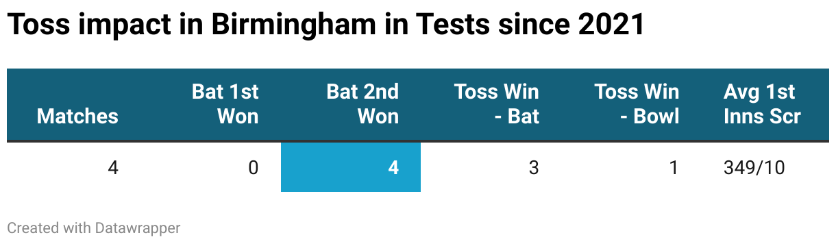 Looking at the toss in Birmingham in recent years, like Leeds all matches have been won by the Team batting second. But of the four Tests, captains have decided to bowl only once. The average first innings score is 349.