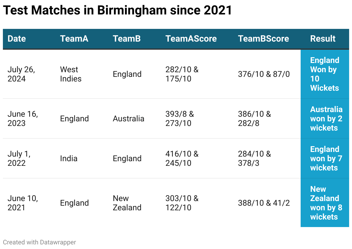 In the last four Tests in Birmingham, England have managed to win only two of those with one against India in 2022, where they chased a massive target of 378 with ease.