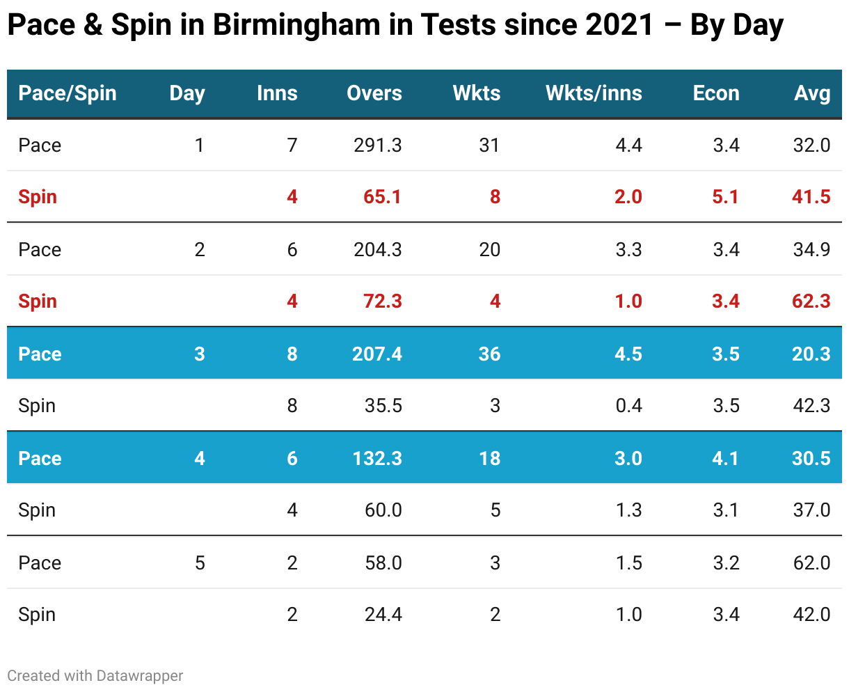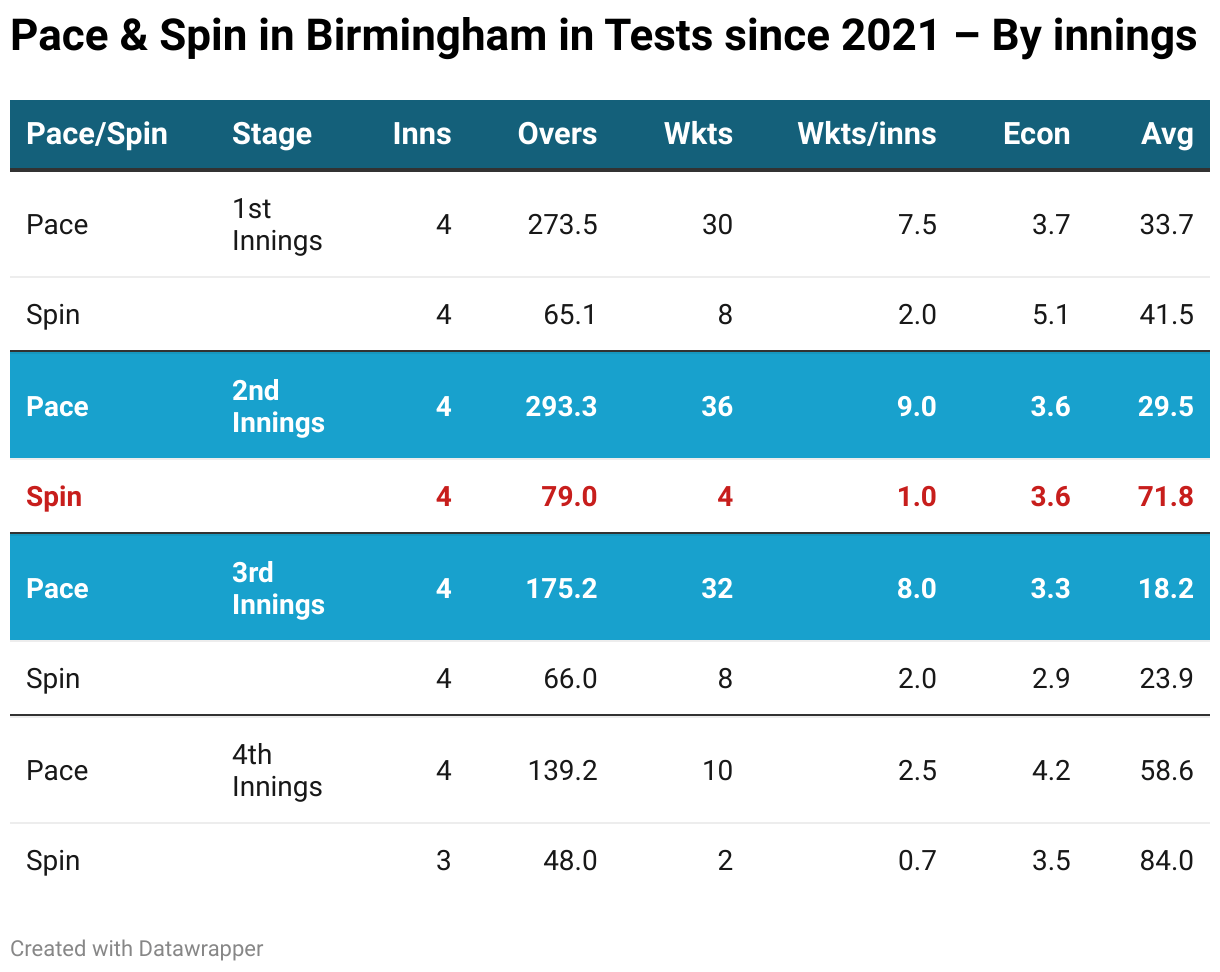 Across the four innings, pacers have been good in the first three taking an average of eight wickets per innings. Both pace and spin has been hammered in the fourth innings though. Spinners, on the other hand, have been decent in third innings and have been horrible in the second innings, averaging 71.8