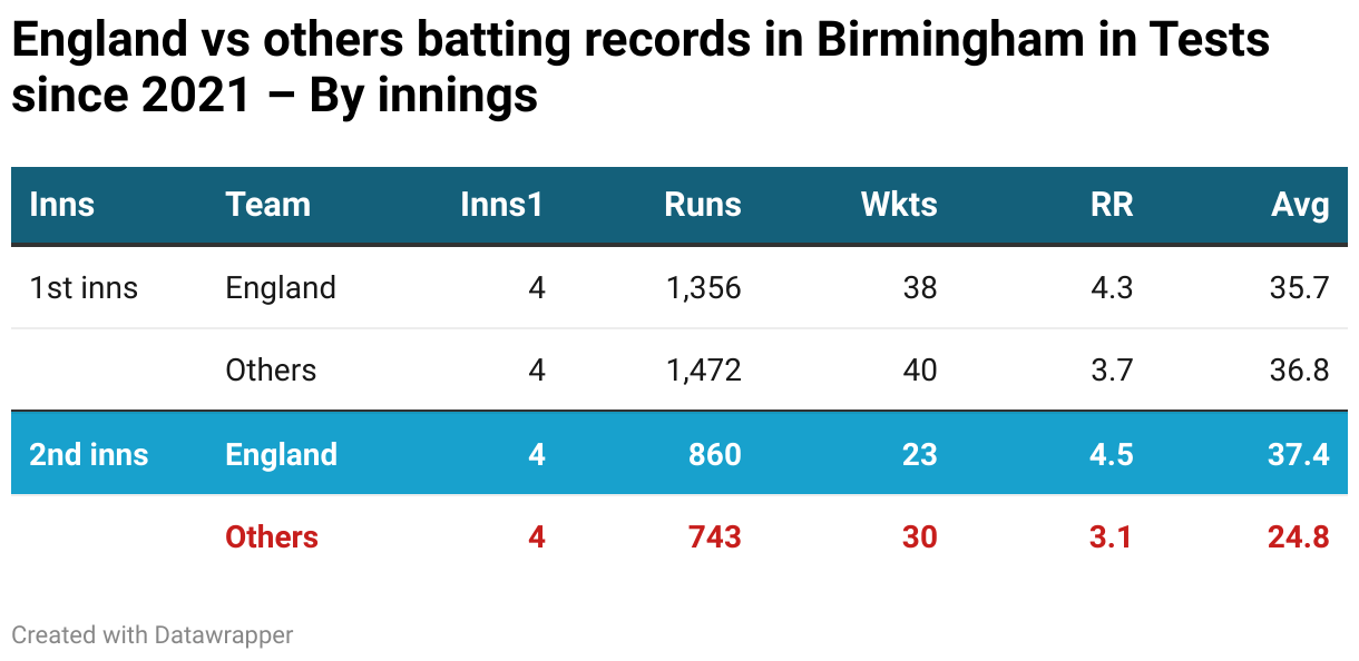 England have been outstanding in playing aggressive cricket in Birmingham as they have maintained a run rate above four runs per over. They are outstanding batting in the second innings as they have averaged better than first innings and have scored at 4.5 runs per over. On the contrary, the visitors while batting in the second innings have struggled to score runs and have averaged below 25.