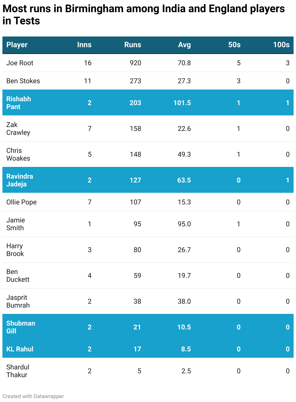 Looking into the second Test in Birmingham, Joe Root will be expected to be the best batter for England as the right-hander has an average of 70.8 with eight 50+ scores in 16 innings at the venue. Among Indian batters, Rishabh Pant will be expected to continue his good form from first Test as his record in Birmingham is terrific, with him averaging 101.5 with a fifty and a century in the two instances he has batted here.