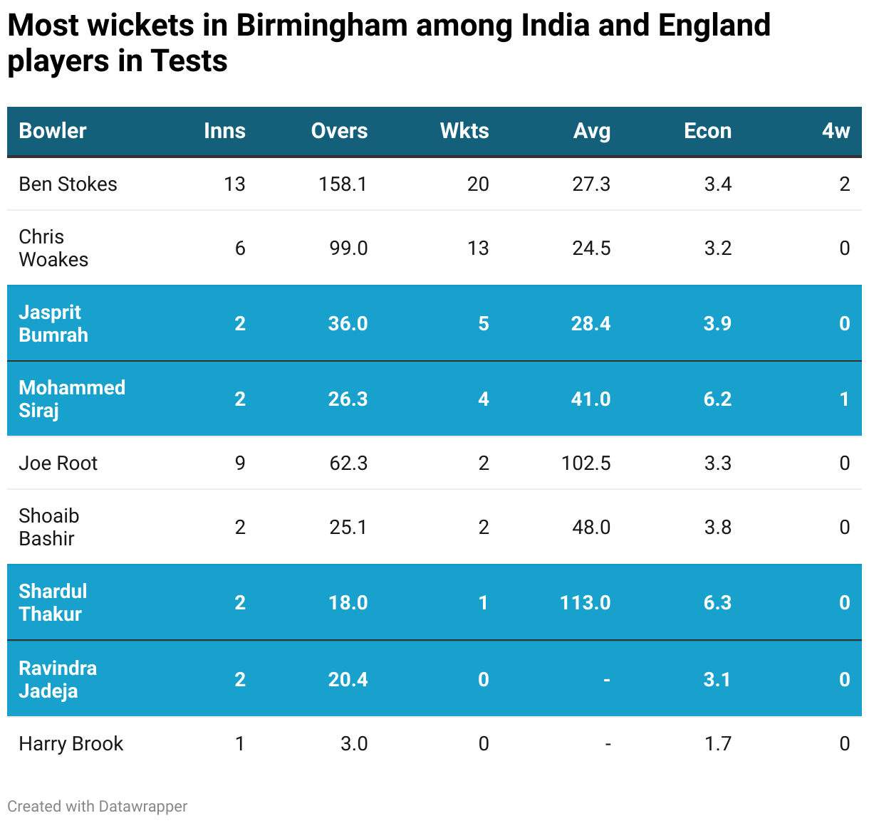 Ben Stokes has done well in Birmingham, taking 20 wickets with two four-wicket hauls. Chris Woakes also has done well on his home ground too, taking 13 wickets. Barring Prasid Krishna, the other four Indian bowlers played in Birmingham the last time they were in England in 2022. Siraj was expensive, going at 6.2 RPO while Shardul was worse, as he averaged 113 while going at 6.3 RPO.