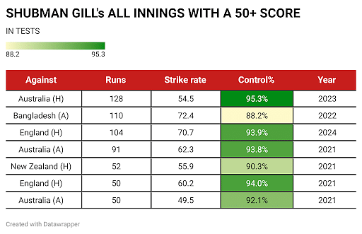 Control has been a vital factor in Gill’s career. The right-hander has seven 50+ scores in Test cricket now; on six occasions, he had a control of over 90%. Clearly, he looks like a million dollars when he is for a long stay at the crease.