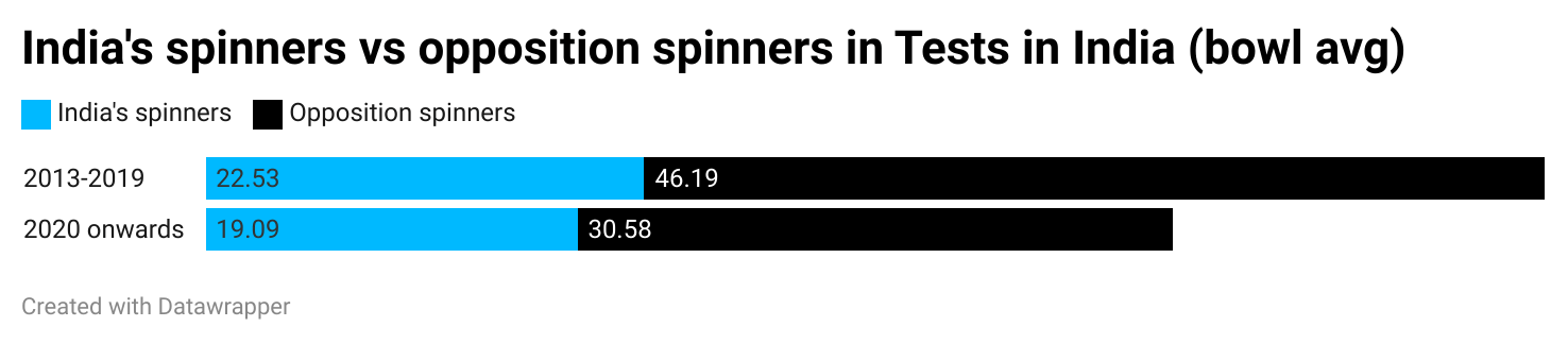 From the start of 2013 till the end of 2019, in Tests in India, Indian spinners took 419 wickets in 3,618 overs at an average of 22.53.