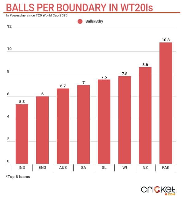 In the 13 innings since the T20 World Cup in Australia 2020, Pakistan have managed to score 390 runs at a run rate of five runs per over and a ball per boundary ratio of 10.8 compared to 540 runs at a run rate of 6.9 and a boundary every 5.3 deliveries in the powerplay by the Women in Blue.