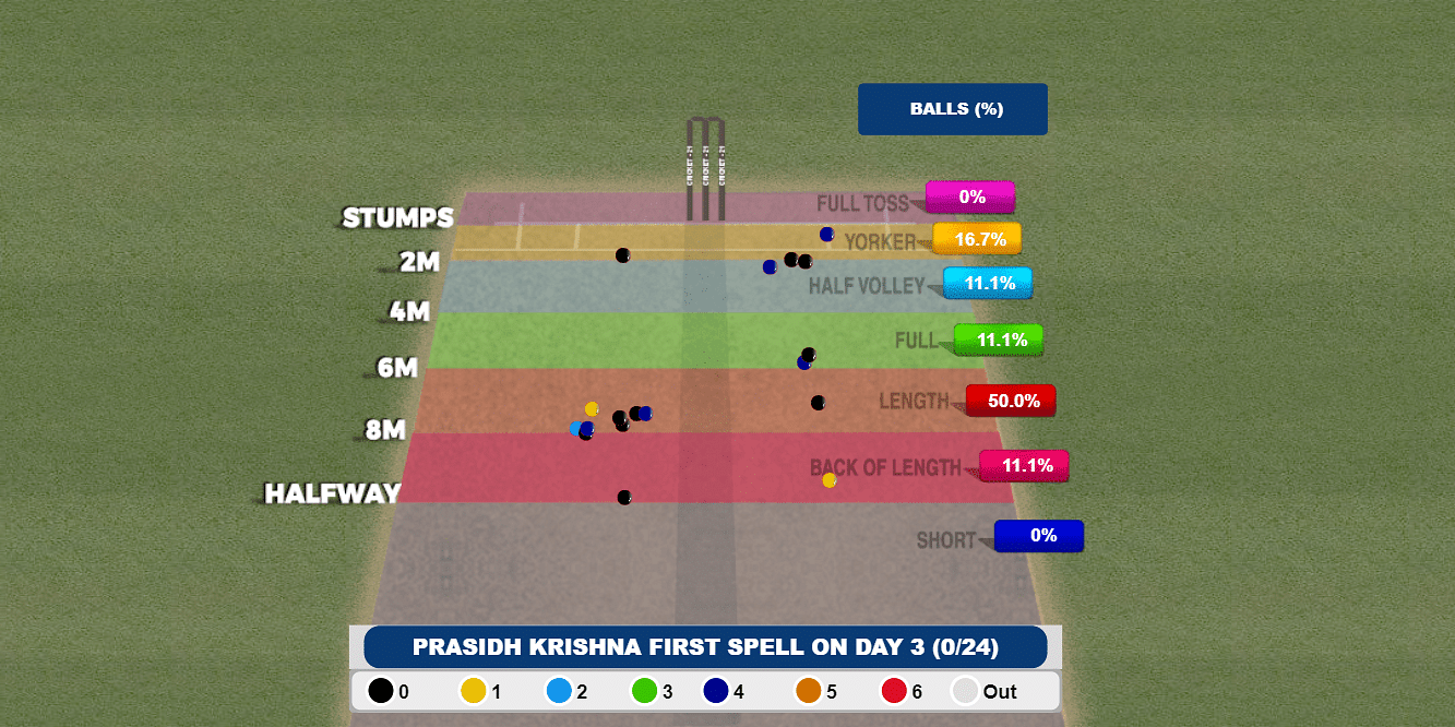 Between them, Bumrah & Siraj bowled six boundary-less overs but Prasidh conceded back-to-back boundaries instantly, the second of the two being a leg-stump full toss. He conceded 16 more runs off his next 2 overs before getting taken out of the attack.