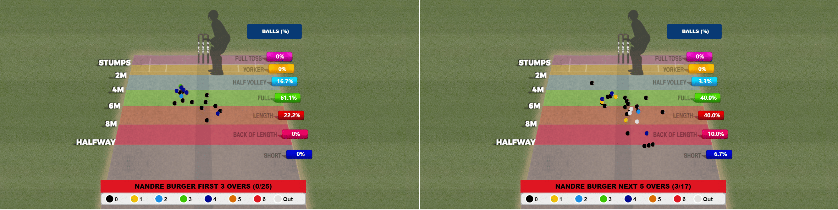 After an extremely loose start, conceding 25 off his first 3 overs and overpitching a lot, Nandre Burger course-corrected and kept South Africa in the contest by striking thrice.