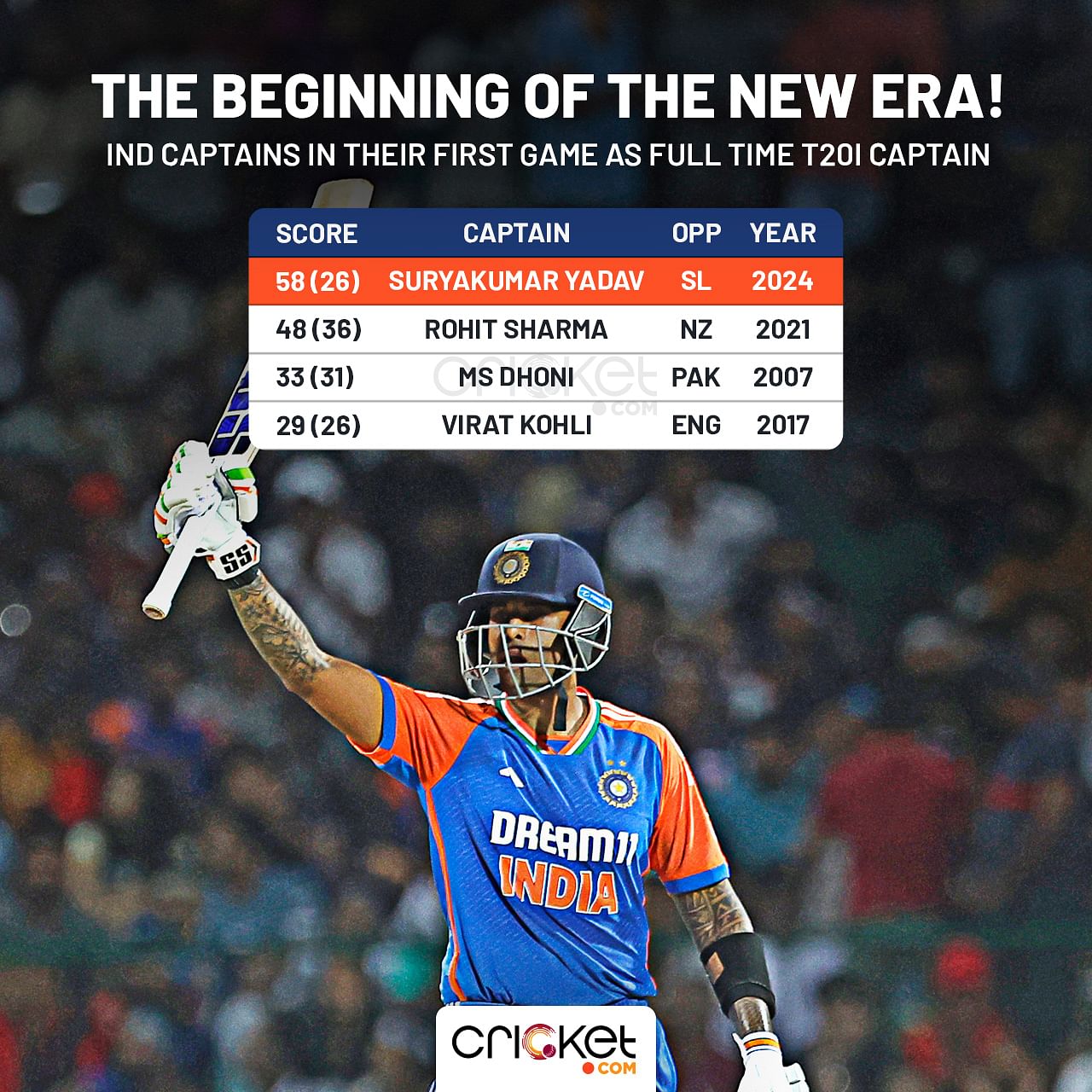 Mr. 360 smashed 58 off 26 deliveries, hitting Sri Lankan bowlers all around the park. The right-handed batter tonked eight fours and two maximums during his stay in the middle and registered the highest score for a full-time Indian captain. There were those trademark flicks over fine leg, sweeps towards square leg, and lofted drives as well - SKY looked calm and composed and in his true elements.