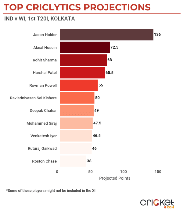 Our Criclytics Player Projector predicts Holder to take 4-5 wickets and score 8-12 runs