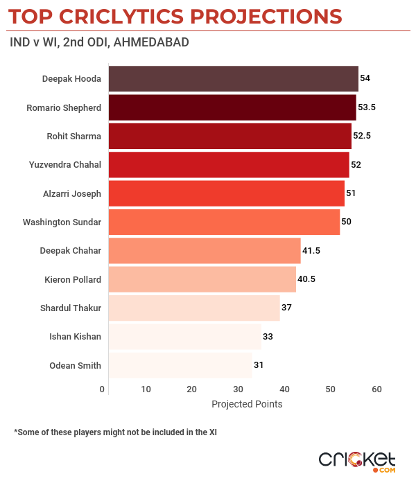 The Ahmedabad surface was slow and offered a lot of assistance to the spinners, especially in the first innings. Chahal scalped four wickets, while Washington took three. Hence, it would be ideal to have at least three spinners in your team. In the batting department, West Indies haven't batted out 50 overs for seven games in a row now and have the worst batting average (26), balls/wicket (32.1) and scoring rate (4.9) amongst the top-10 teams since 2020. So, it won’t be a bad idea to have more Indian batters in your side.