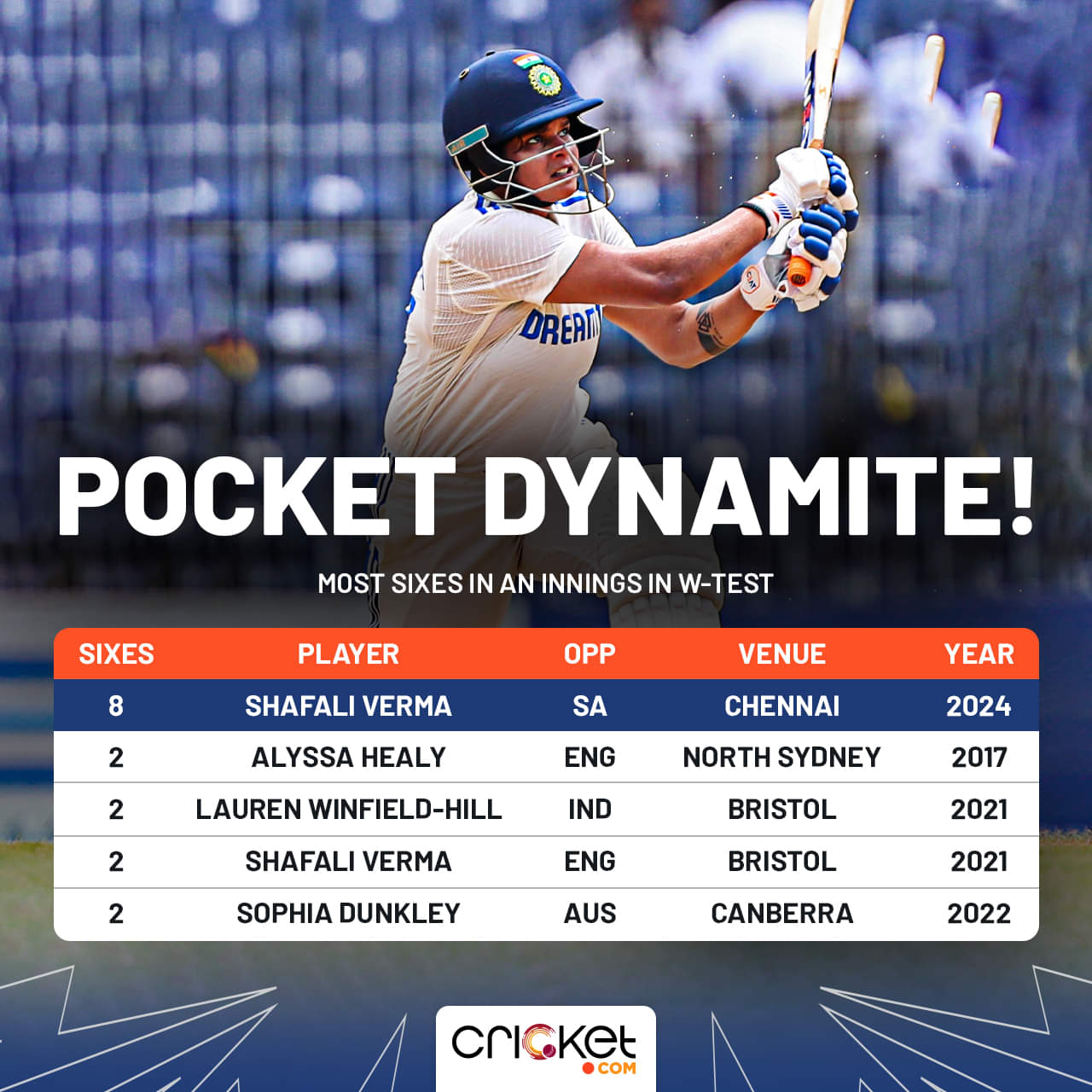 > Shafali hit the most number of sixes in a W-Test innings.