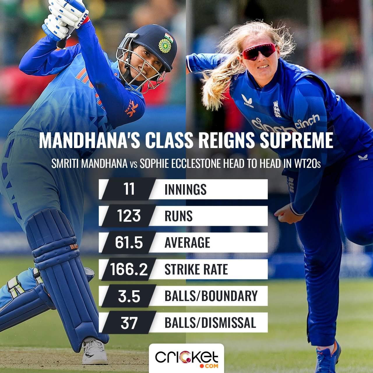 Against England, she averages only 14.8 in 10 innings. Katherine Sciver-Brunt and Sophie Ecclestone have subverted Shafali, dismissing her twice each for under 40 runs. Sciver-Brunt has retired, which gives Shafali some leeway, but she still has to counter Ecclestone.
