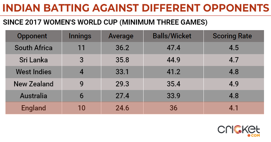 During this period, India have played a decent number of ODIs against South Africa, Australia, West Indies and New Zealand, but it’s England against whom they have the worst batting average and scoring rate. Mandhana and skipper Mithali Raj average 50 against England but have a strike rate of way below 80. On Wednesday, India had a perfect opportunity to all but knock out England but their batters once again let them down, with only Mandhana and Richa Ghosh managing to touch the 30-run mark.