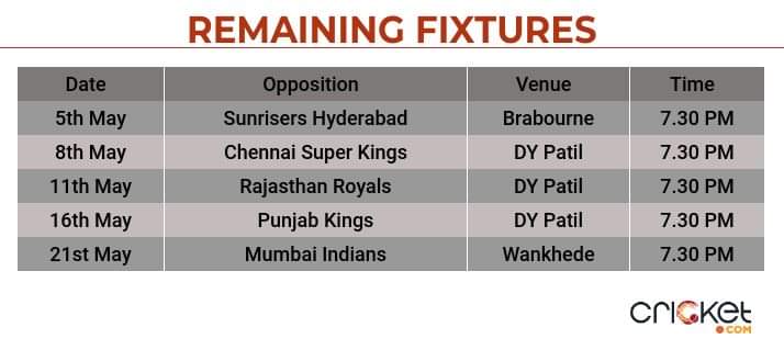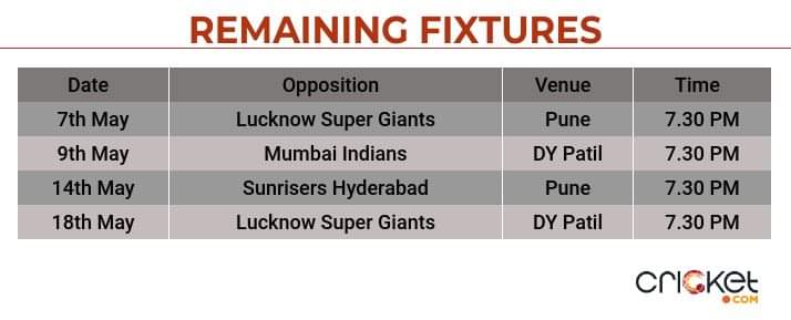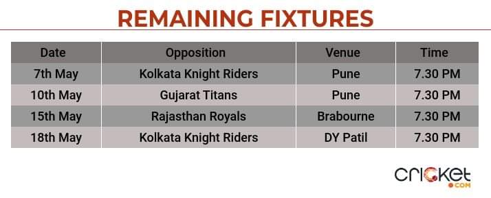 The Challengers face an uphill task of qualifying for the final four and need to win three out of their four remaining fixtures. The Faf du Plessis-led outfit endured a dismal outing and were bundled out for 68 runs against Sunrisers, which has also dented their Net Run Rate.