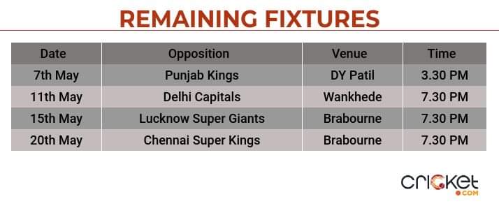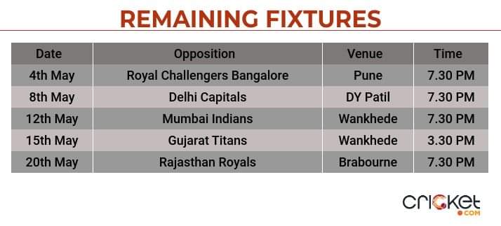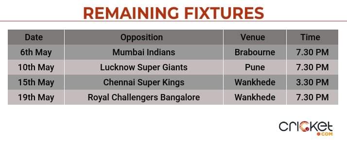 With KL Rahul at the helm, Lucknow recorded a six-run win against Delhi in a nail-biting encounter and will look to continue the momentum in the upcoming matches. Lucknow lock horns against the Knight Riders twice in their four remaining fixtures and will need a solitary win to reach 16 points and secure their place in the playoffs.