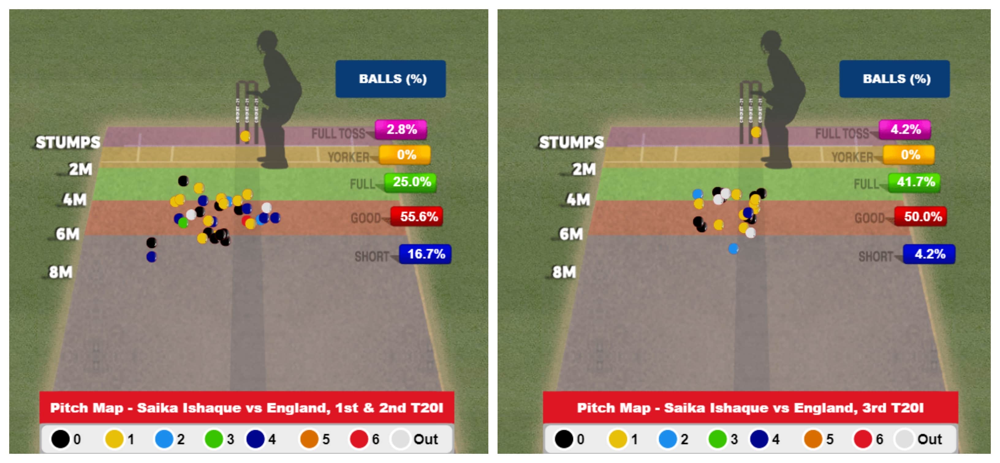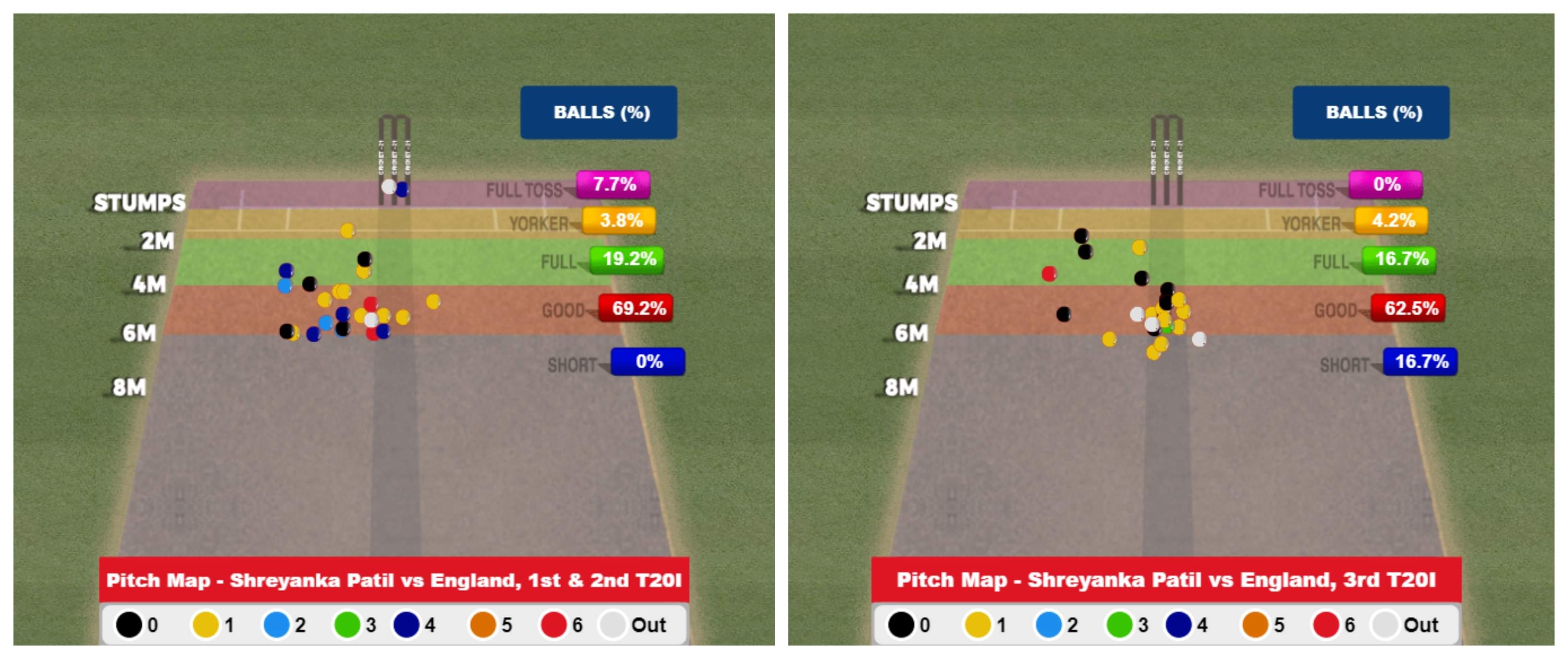 Shreyanka, who’s quite a crafty off-spinner who regularly plays with angles and lengths, was wayward in the first two games. She was still pitching a lot of deliveries at the good length, but her line was awry, as evident in the pitch map. However, today, except for a few balls, she targeted the stumps and got a bowled and an LBW in her three wickets.