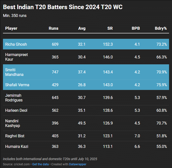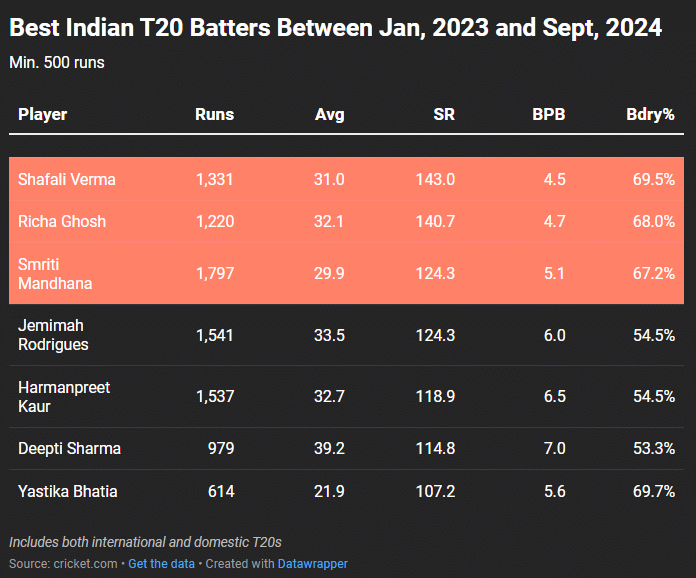 Between the 2023 T20 World Cup and the 2024 one, the Indian batter with the best strike rate was Verma. However, only Richa Ghosh and her batted at a strike rate north of 140 in that period. The remaining others failed to score boundaries at regular intervals. That’s why it wasn’t a surprise when India succumbed to run-scoring pressure on multiple occasions in this period.