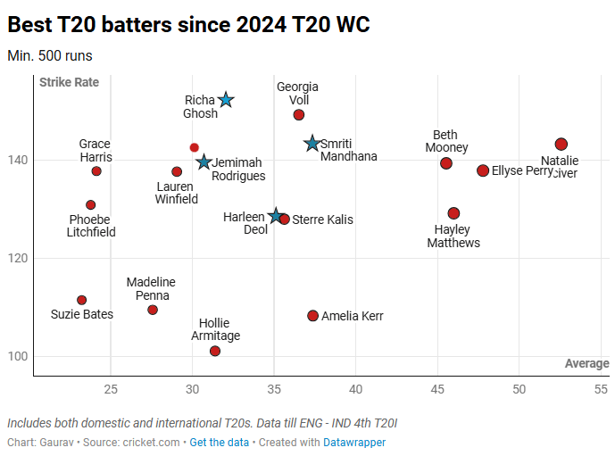 In fact, even if you compare the Indian batting with worldwide trends in the same period (min 500 runs), there are three Indian batters at the higher end of the spectrum. Moreover, in a list that’s full of Australian batters, it shows that the batting transformation is well and truly under as batters like Harmanpreet and Verma weren’t able to make a space for themselves on this scatter plot due to the cutoff of 500 runs as they don’t play as many franchise or domestic T20 games.