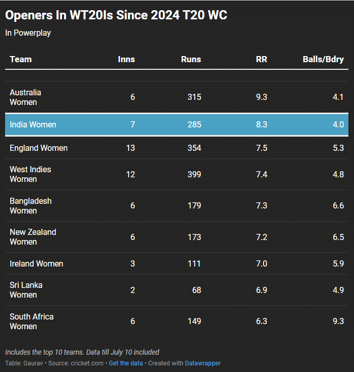 Suppose you look minutely at this change in the Indian batting. In that case, you’ll find that it’s the Indian opening pair of Mandhana and Verma who have not done the bulk scoring, but have also done it at a rapid pace, with only the Australian batting pair doing better than them. The same intent and process was visible in the fourth T20I against England recently, where Indian openers polished off the majority of the 127 run chase as India won their first ever T20I series in England.