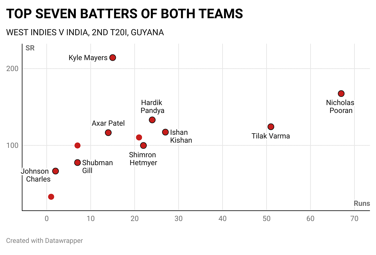 Quite like his 41 in the first T20I, Pooran’s 40-ball 67 turned out to be the point of difference between the two sides. In a game where the mean strike-rate was 132.8, Pooran mustered runs at 167.5. For India, no batter in the top seven managed a strike-rate beyond 135.