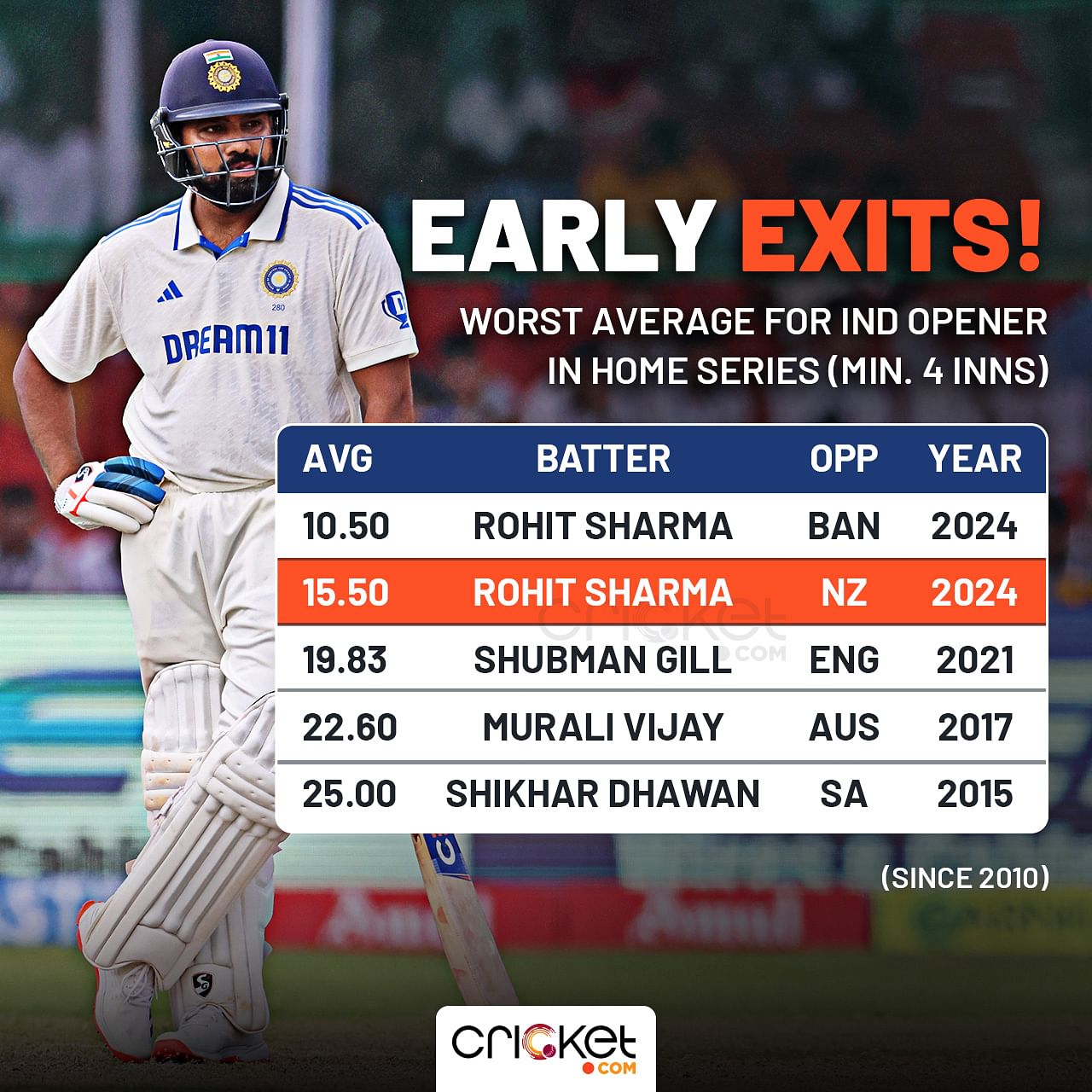 Since 2010, an Indian opener has failed to average more than 16 in a home series on two occasions, and ironically, both of those campaigns belong to one man—Rohit. Despite the right-hander showing his prowess in the red-ball format at the start of this decade, there’s a decline in numbers that can’t really be ignored.