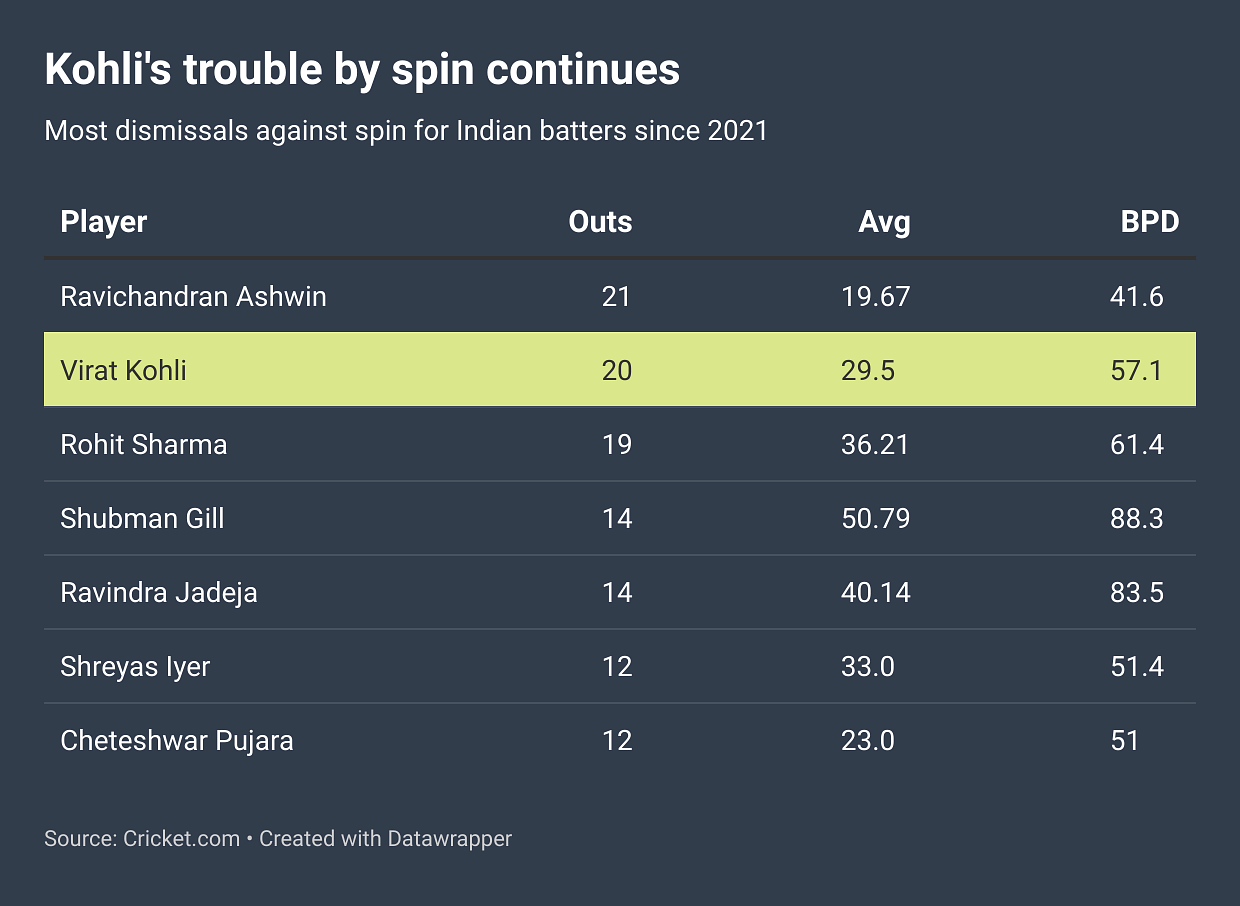 With the exception of Ashwin (21 dismissals), no other Indian batter has been dismissed as many times as Kohli has against spin (20), out of which ten have come off the bowling of left-arm spinners, against whom he averages 27.3. The decline in his returns, from averaging 74.64 from 2012-20 to 27.3 since then against left-arm spinners, is definitely a big concern.