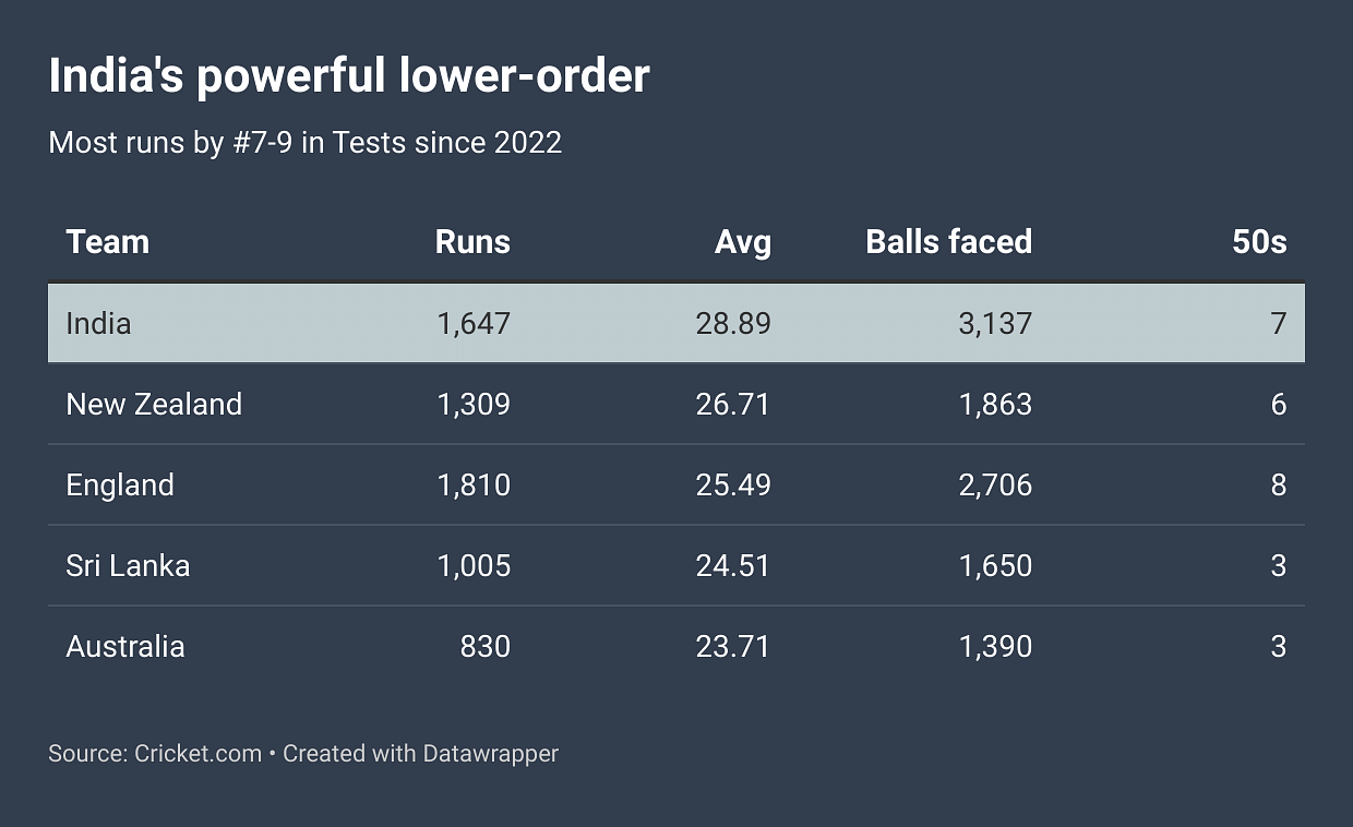 India's lower-order (7-9) has been too strong in home Tests since 2022, with 1647 runs, averaging a staggering 28.89, including seven fifty-run partnerships.