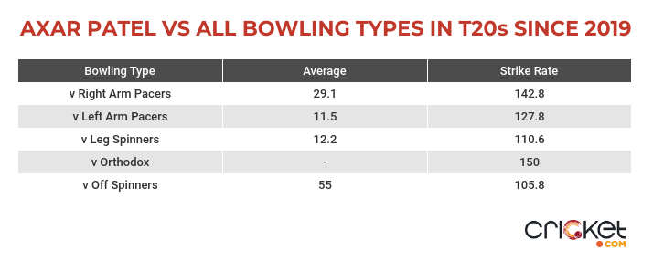 Axar is a fine like-for-like replacement for Jadeja when you factor-in his ability with the ball and the package he brings to the fore, but though he’s struck at 150 against left-arm spinners since the start of 2019, his overall SR against spin in the last three years still reads a mere 119.75. He’s left-handed, yes, but there is no real evidence to suggest that the 28-year-old could be an effective floater that can nullify spinners in the middle.