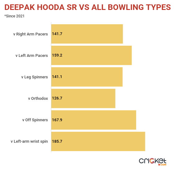 This is another batting-oriented combination, the one the management opted to go for in Sunday’s clash against Pakistan. On the night, the middle/lower-order failed to click, but the quality of individuals present still makes it a devastating unit. Pant got the nod over Karthik against Pakistan owing to his left-handedness, but Hooda’s prowess versus spin means there’s even an avenue for the management to go with an all-righthanded top six. Since 2021, Hooda averages 53.14 and has struck at 143.63 versus spin, and has been impressive against both left-arm spinners and leg-spinners, boasting an overall SR of 135.7 against the two bowling-types.