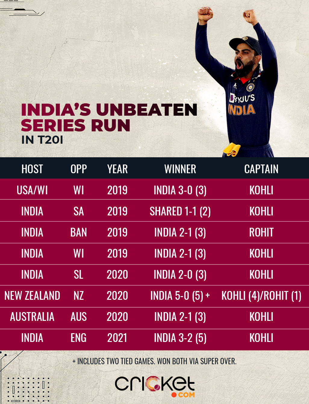 Since India lost 0-2 to Australia at home in February 2019, they are yet to lose a T20I series. During this period, they have won seven and shared one. Three of their series wins have come away from home. India has now also won their last six T20I series. The details are provided below.
