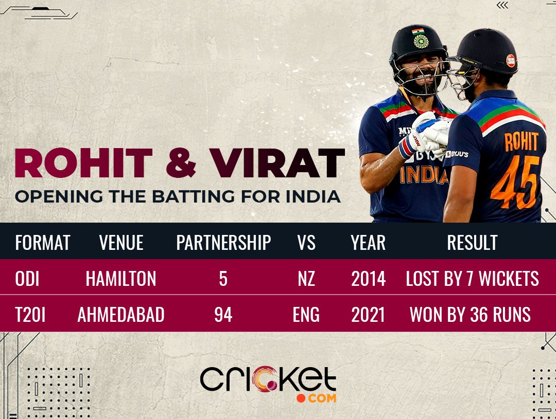 Since Virat Kohli has never opened for India in Test matches, it obviously means that Rohit Sharma and Kohli has never opened together in Tests. However, although Kohli has opened on six occasions in ODIs, he has paired with Rohit Sharma only once. This happened in the Hamilton ODI on 28 Jan 2014. With Kohli being dismissed for 2, the pair could just muster 5 runs for the opening wicket. Rohit made a 94-ball 79. The home side won by 7 wickets. Incidentally, this was the first and last time they opened the Indian batting in any format for India until the recent Ahmedabad T20I when they put on 94 runs. The table below has the details.