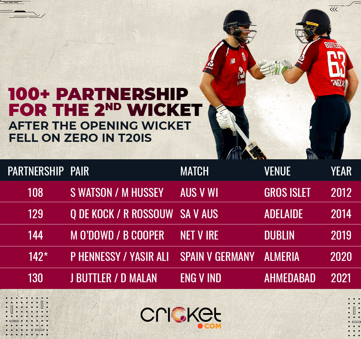 I presume you are referring to the latest occurrence when Jos Buttler and Dawid Malan put on 130 runs for the second wicket in the deciding T20I match at Ahmedabad after Jason Roy was dismissed without a run on the board. This has occurred only on five occasions in T20I cricket. Interestingly, in all the five occasions the sides were chasing. However, the English pair at Ahmedabad was the first to be involved in a losing cause.