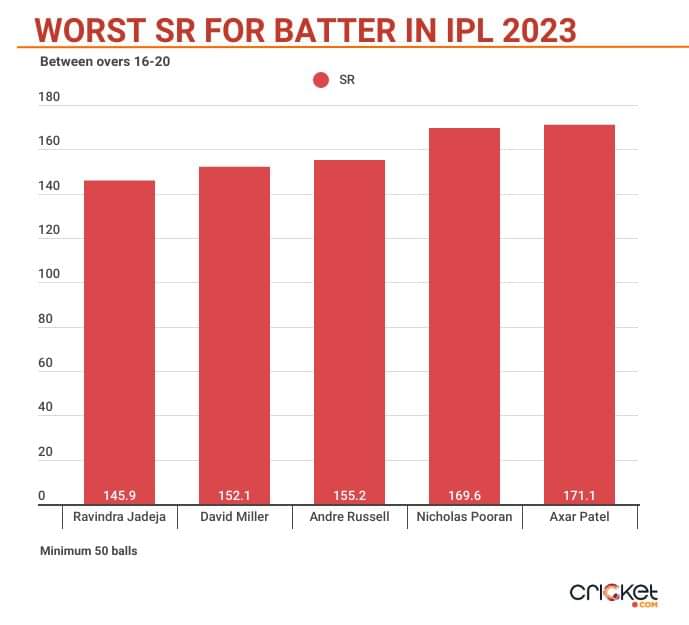 In this edition, Jadeja has scored 89 runs off 61 deliveries between overs 16 to 20 at a strike rate of 145.9, which is the lowest among batters who have faced a minimum of 50 deliveries in that phase.