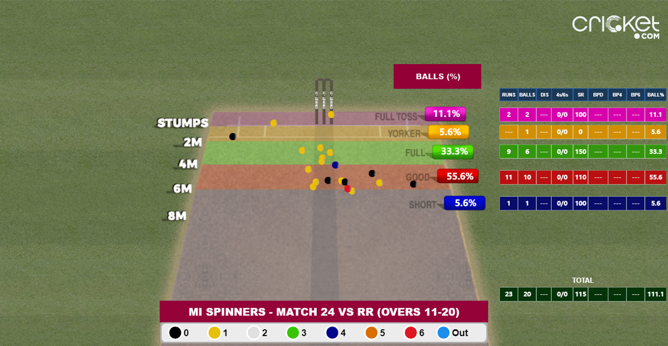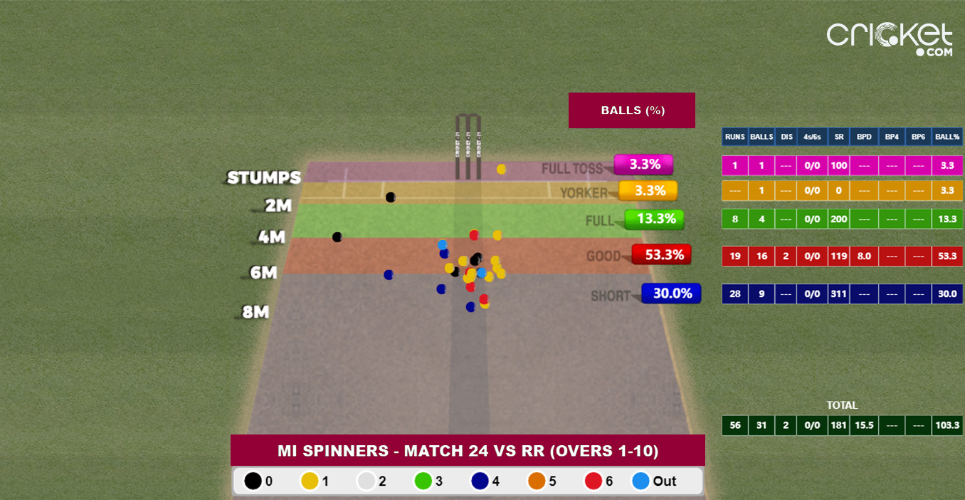 It was then Rajasthan chose to continue with Dube at number four, though this time, half of the innings was done with. In a 31-ball stay, Dube had only four boundary shots - two fours and as many sixes – too few when the knock included 15 dot balls. Apart from Coulter-Nile troubling him with his pace, Mumbai spinners too learnt their lessons from the first half. After keeping it short due to a concern over short straight boundaries, the spinners were better with their lengths in the second half. The RR batsmen had a strike rate of 181 against spin in the first 10 overs and only 115 in the next 10.