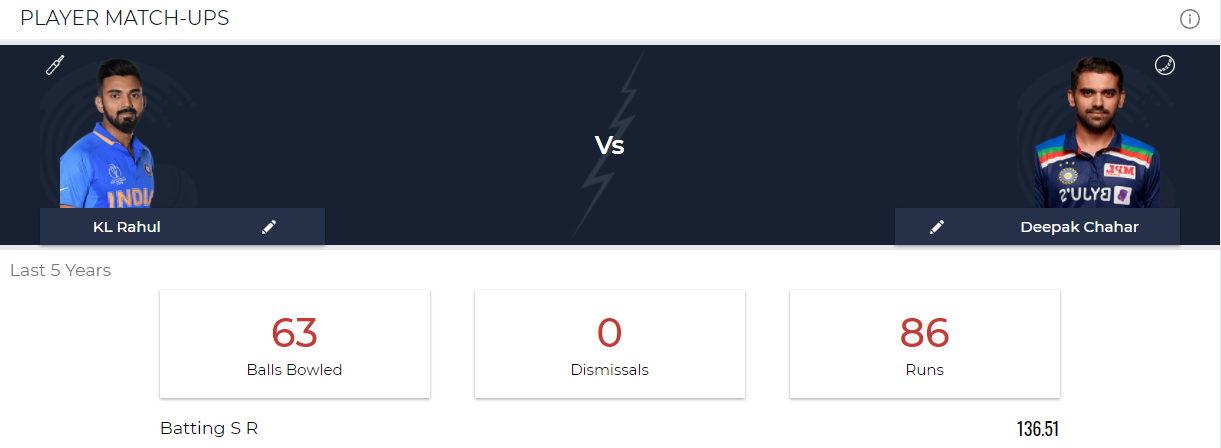 While Deepak Chahar tormented the Punjab Kings last time when these two sides met each other, he still wasn’t behind KL Rahul’s downfall. In 63 balls that Chahar has bowled to Rahul, the Indian opener has scored 86 runs, at a strike-rate of 136.51 without being dismissed once. Given Rahul’s importance to the Punjab setup, it would be crucial for Chennai and Chahar to turn this form around against Rahul if they are to win their last league encounter.