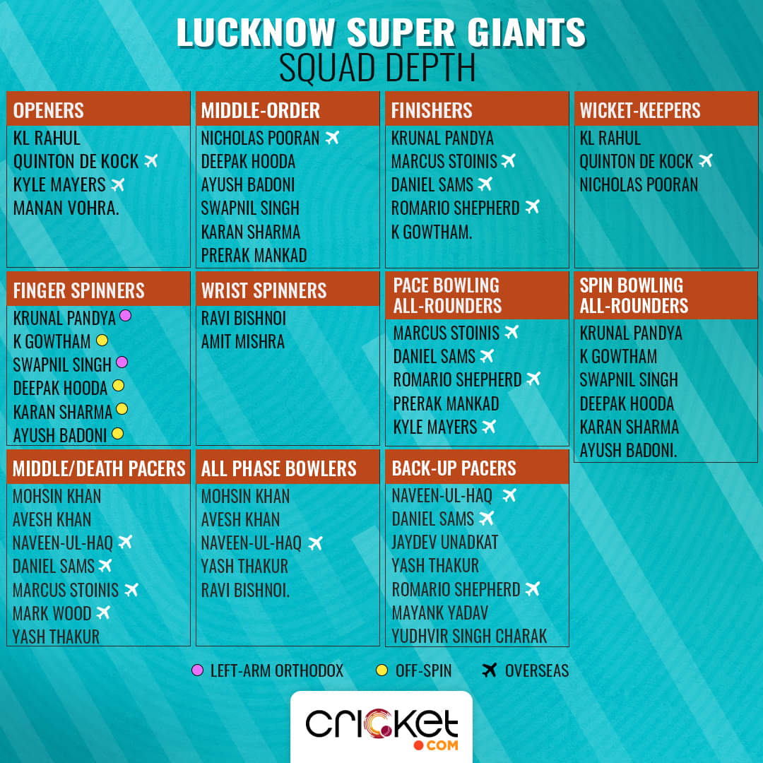 The plethora of all-rounders will allow Lucknow to go with the same XI in most of their home and away matches. Four bowling options (three spin and one pace) and three left-handers in the top-seven, Lucknow could also simply play around with their Impact Player depending on the match scenarios and conditions.