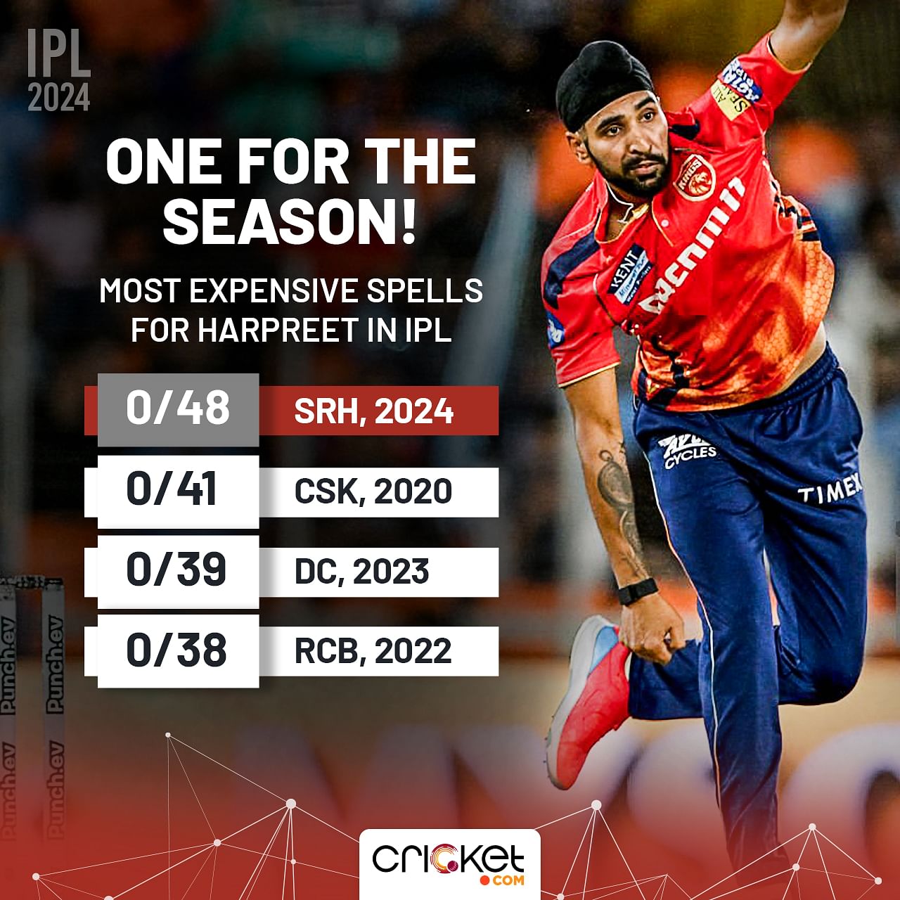 Harpreet Brar finished with figures of 0/48 - his most expensive spell in the IPL. The left-arm spinner conceded only 11 runs in his first two overs before being ripped apart by Nitish Reddy.