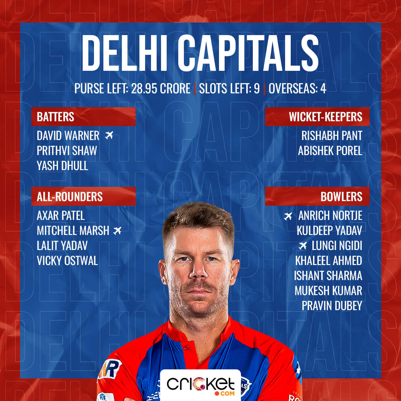 Current Probable XI: Prithvi Shaw, David Warner*, Mitchell Marsh*, Rishabh Pant (subjected to fitness), Overseas Wicketkeeping Middle-Order Batter*, Axar Patel, Lalit Yadav, Seam Bowling All-Rounder, Kuldeep Yadav, Anrich Nortje*, Khaleel Ahmed