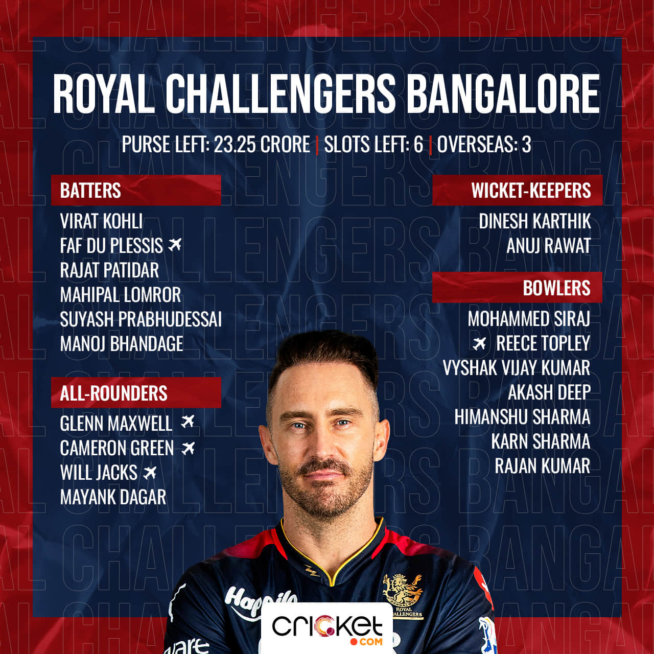 With du Plessis, Maxwell, Green and Topley, RCB have a powerful but rigid overseas combination in their XI. The return of Rajat Patidar further solidifies their XI. Their overseas purchasing will primarily be about creating backups. They already have a reserve player for Maxwell and du Plessis in Will Jacks.