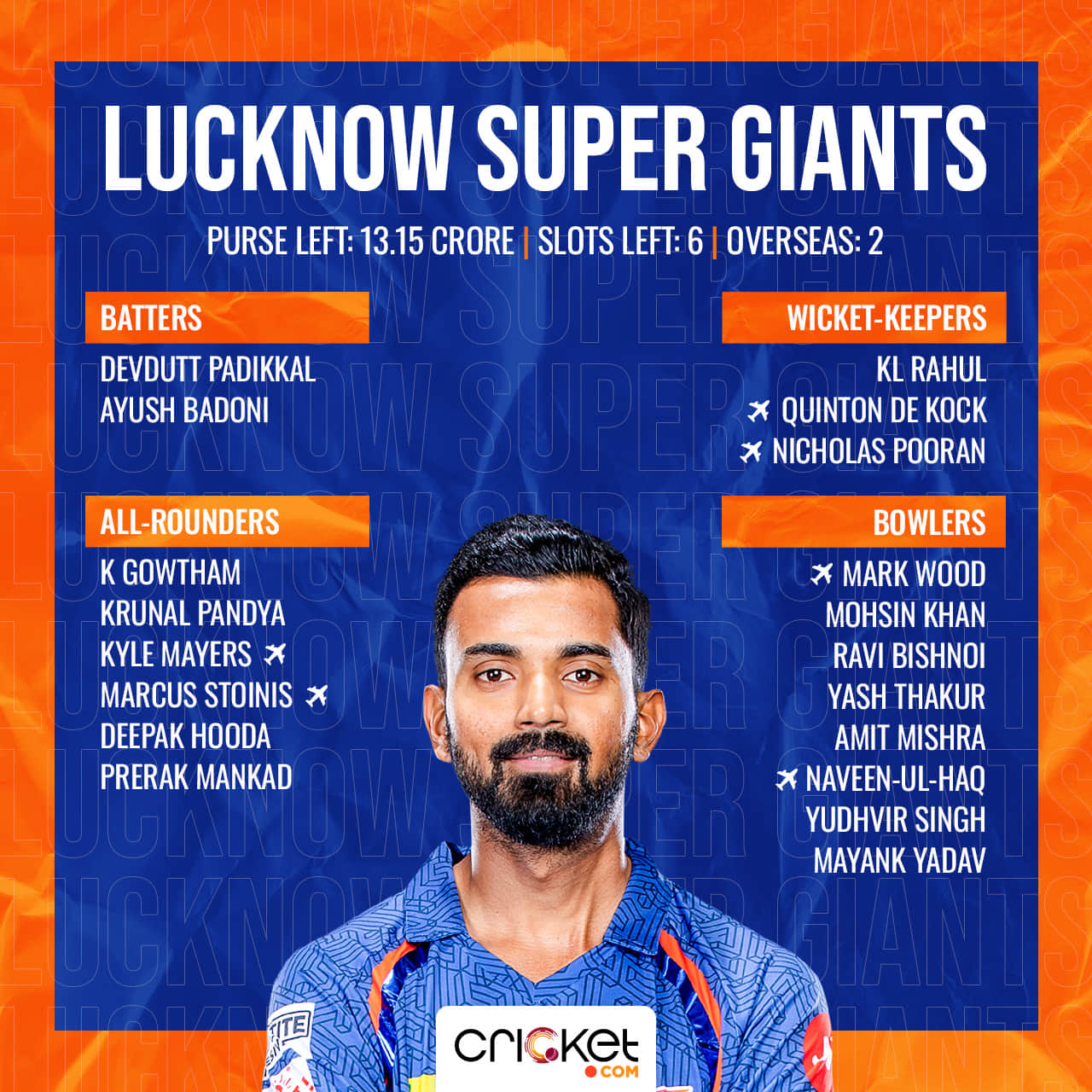 Lucknow released eight players, yet they are a side that will have very little to do at the auction. They have 19 players in their squad with two overseas slots left but hold multiple cards up their sleeves in every department, including the backups. The inclusion of Devdutt Padikkal via trade gives them an extra Indian batter. With reports emerging about KL Rahul set to shift himself to the middle-order, Padikkal can bat at his preferred position, and open the innings alongside Quinton de Kock. Meanwhile, Kyle Mayers can replace any of de Kock, Pooran and Stoinis, if required. They have all three major kinds of spinners too. That leaves us with their fast bowling.