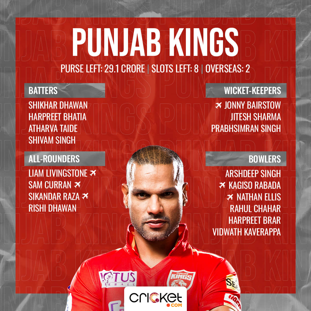 Current Probable XI: Shikhar Dhawan, Jonny Bairstow*, Prabhsimran Singh, Liam Livingstone*, Jitesh Sharma, Sam Curran*, Rishi Dhawan/Harpreet Brar, Nathan Ellis/Kagiso Rabada*, Rahul Chahar, Arshdeep Singh, Indian Pacer