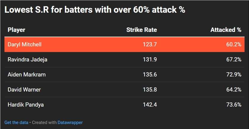 Yet he’s registered the third-lowest strike rate among batters who have faced more than 100 balls. Among those who have maintained an attack percentage over 60%, his strike rate is, by a distance, the worst.