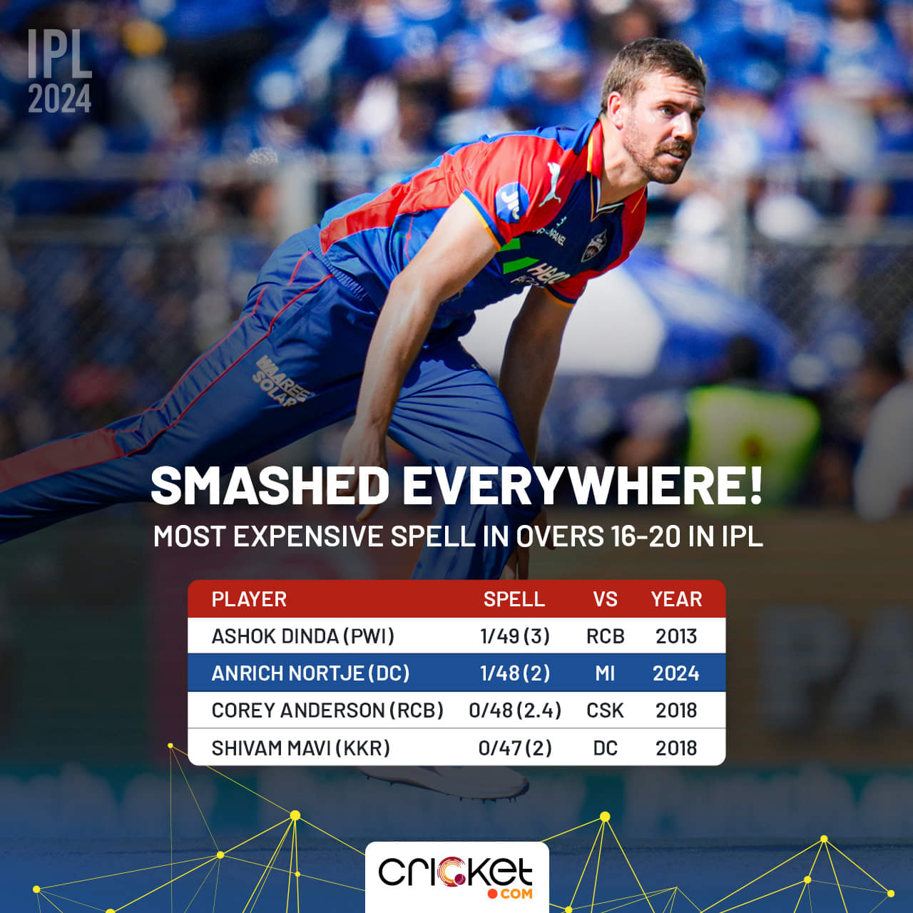 Amongst bowlers who have bowled at least four overs at the death in IPL 2024, Nortje has the worst economy rate. The right-armer has been hit for a boundary every 1.9 balls.