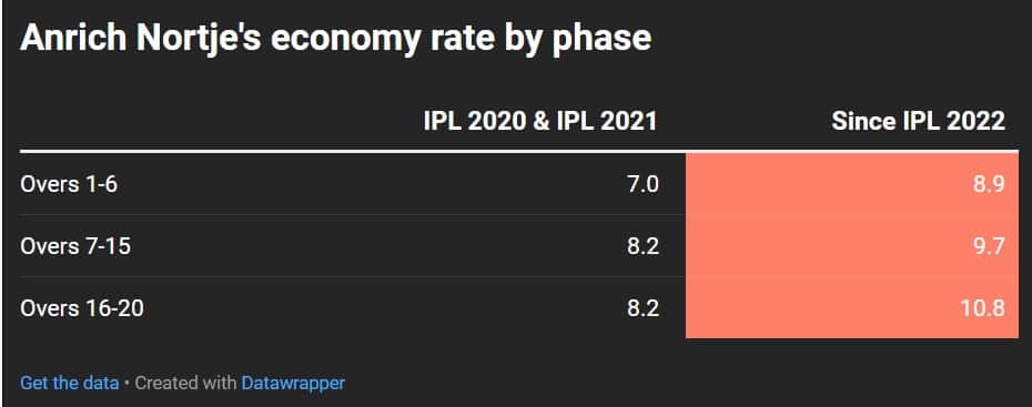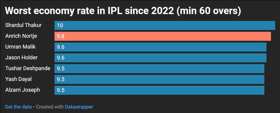 Since the start of 2022, 35 bowlers have sent down 60 or more overs in the IPL. Among them, Nortje’s economy of 9.8 is the second-worst, only behind Shardul Thakur.