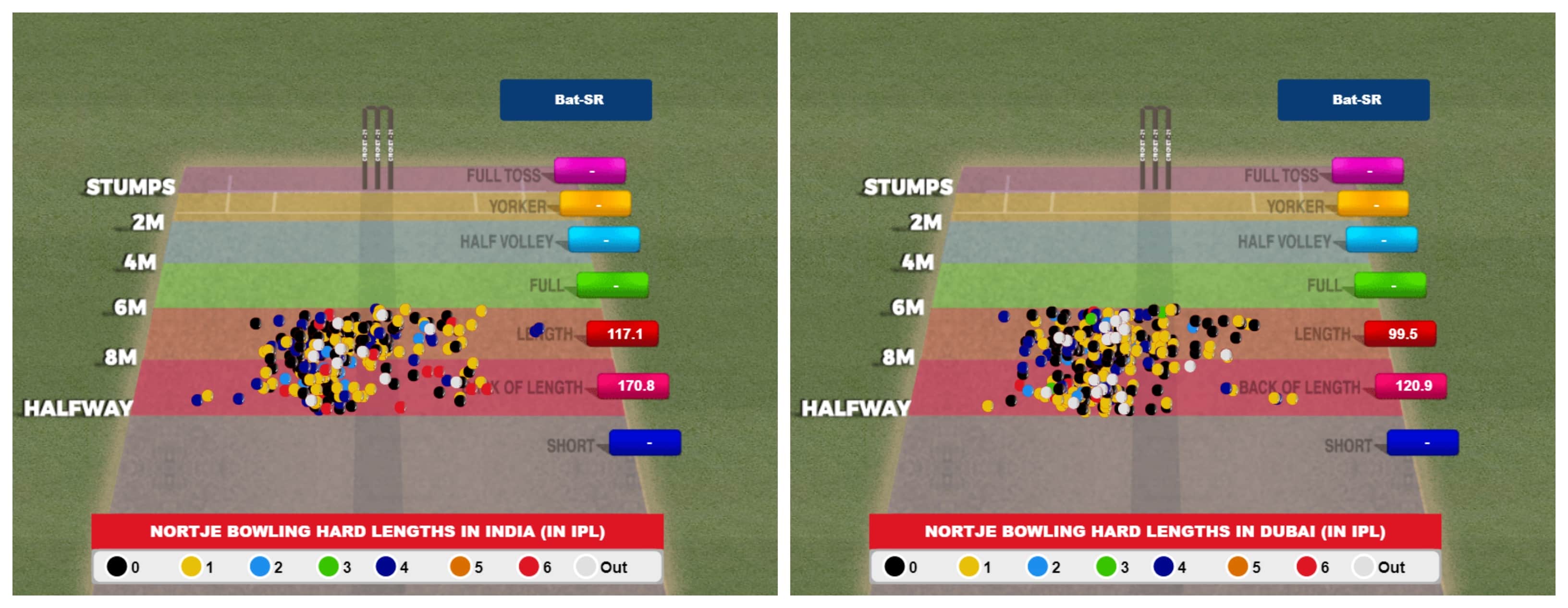 Someone who bowls a ‘heavy ball’, hitting the deck hard and hammering the ball into that back of a length area worked like a charm for Nortje in UAE. 20 of his 34 wickets in the UAE were from either length or back of a length, and batters found it extremely difficult to put him away.