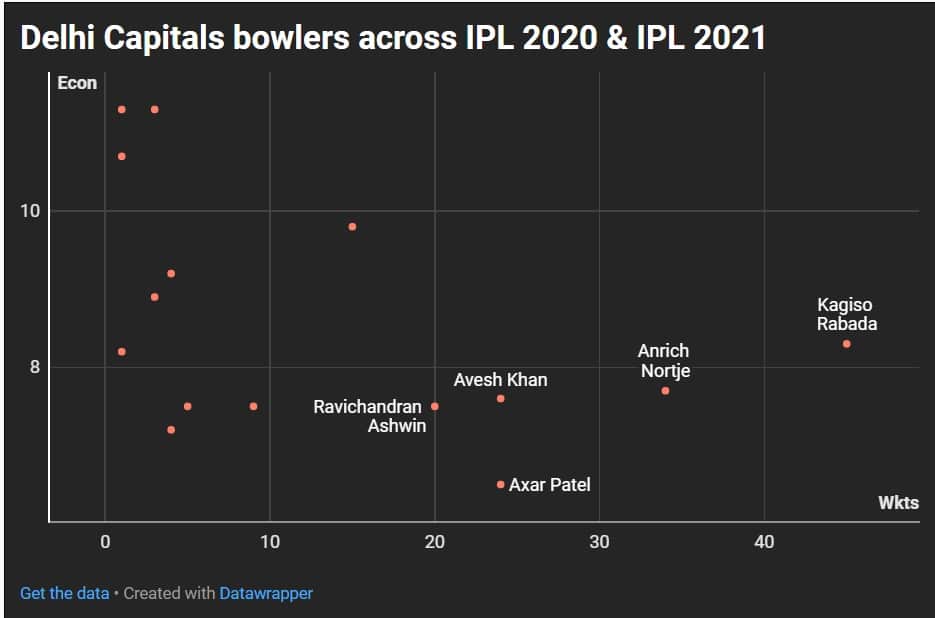 Across IPL 2020 & IPL 2021, only Rabada (45) took more wickets for the Capitals than Nortje (34). Yet Nortje’s average, economy, and impact blew Rabada’s out of the water.