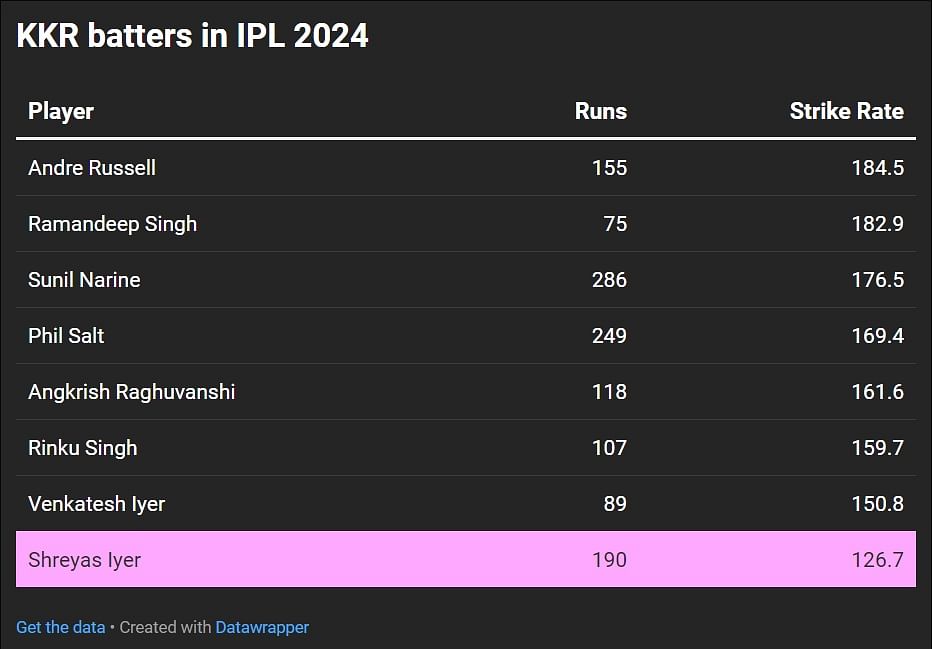 Iyer walked in to bat at No.4, with KKR having lost both Narine and Phil Salt in the space of six balls. There were only four balls left in the powerplay when he walked in.